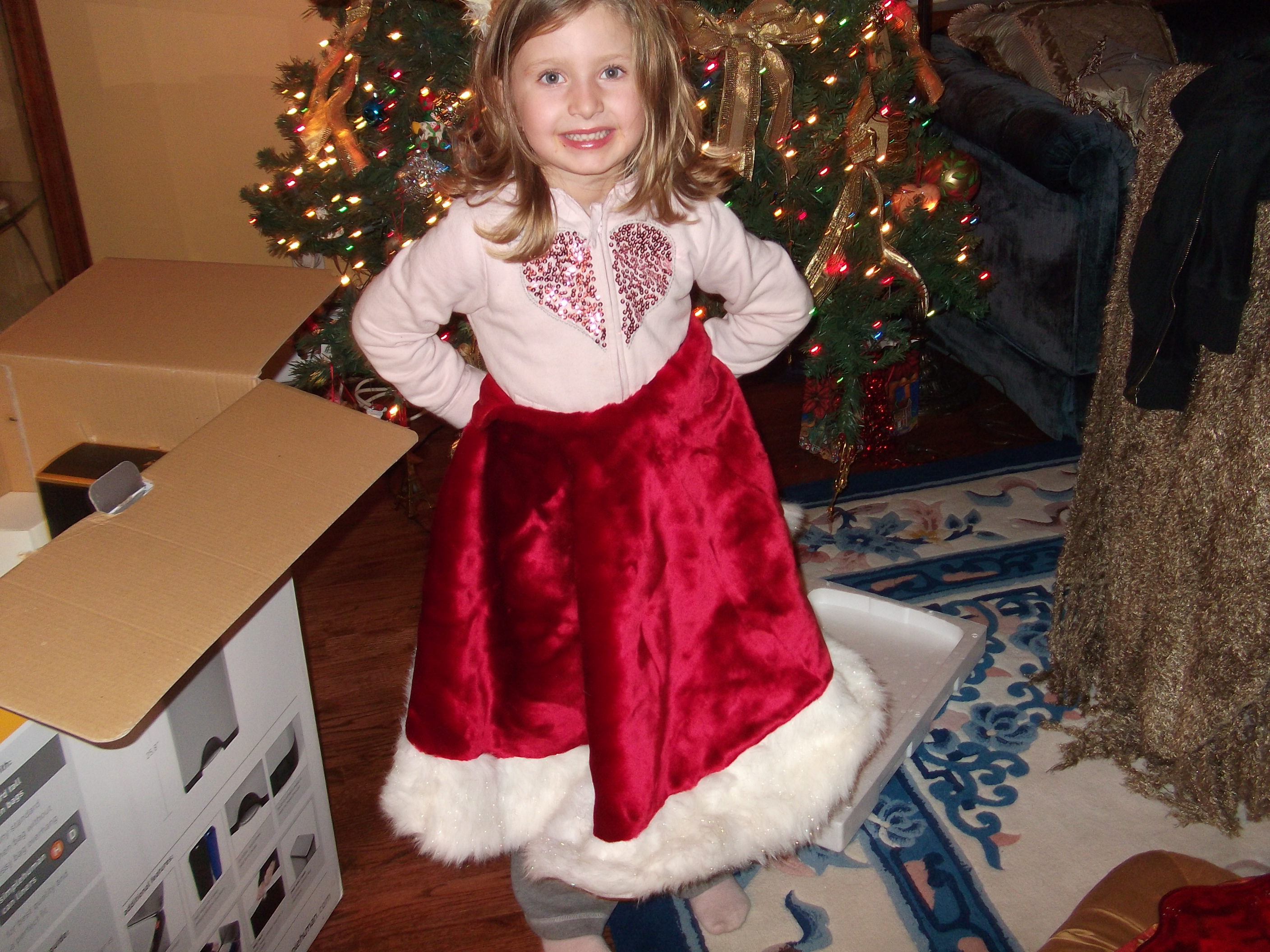 Lovely skirt Sophie but that is for the tree. Let’s get it wrapped around the legs of the tree… you are wearing pants.