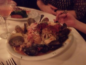 Liz ordered the Fra Diablo …she was shocked when she saw the lobster tail hanging out on top of the spaghetti, and circling the tail… mussels, calamari and clams.