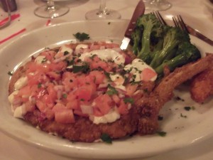 This breaded pork chop was flattened and covered with tomato and mozzarella. I wondered how many hits, with a pallet, it took to get this pork chop this flat…I usually like my pork chops nice and thick, but a flat PC was tenderly good.