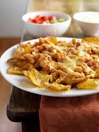 Microwave 1 cup canned low-fat refried beans with just enough water so it’s spreadable. Arrange tortilla chips on a large foil-lined baking sheet, top chips with prepared beans, 2 cups of chicken, 2 cups (8 oz) shredded Mexican cheese blend, 1/2 cup diced tomatoes, and 1/4 cup chopped green onions. Bake for 10 minutes, or until cheese is melted and bubbly. Serve with salsa, guacamole (store-bought or homemade) and low-fat sour cream.