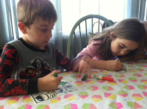While Natalie was playing with Polly Pocket, Liam took all the cardboard packages and made a robot (it took a while) and colored him. Simple, that’s what fun is all about.