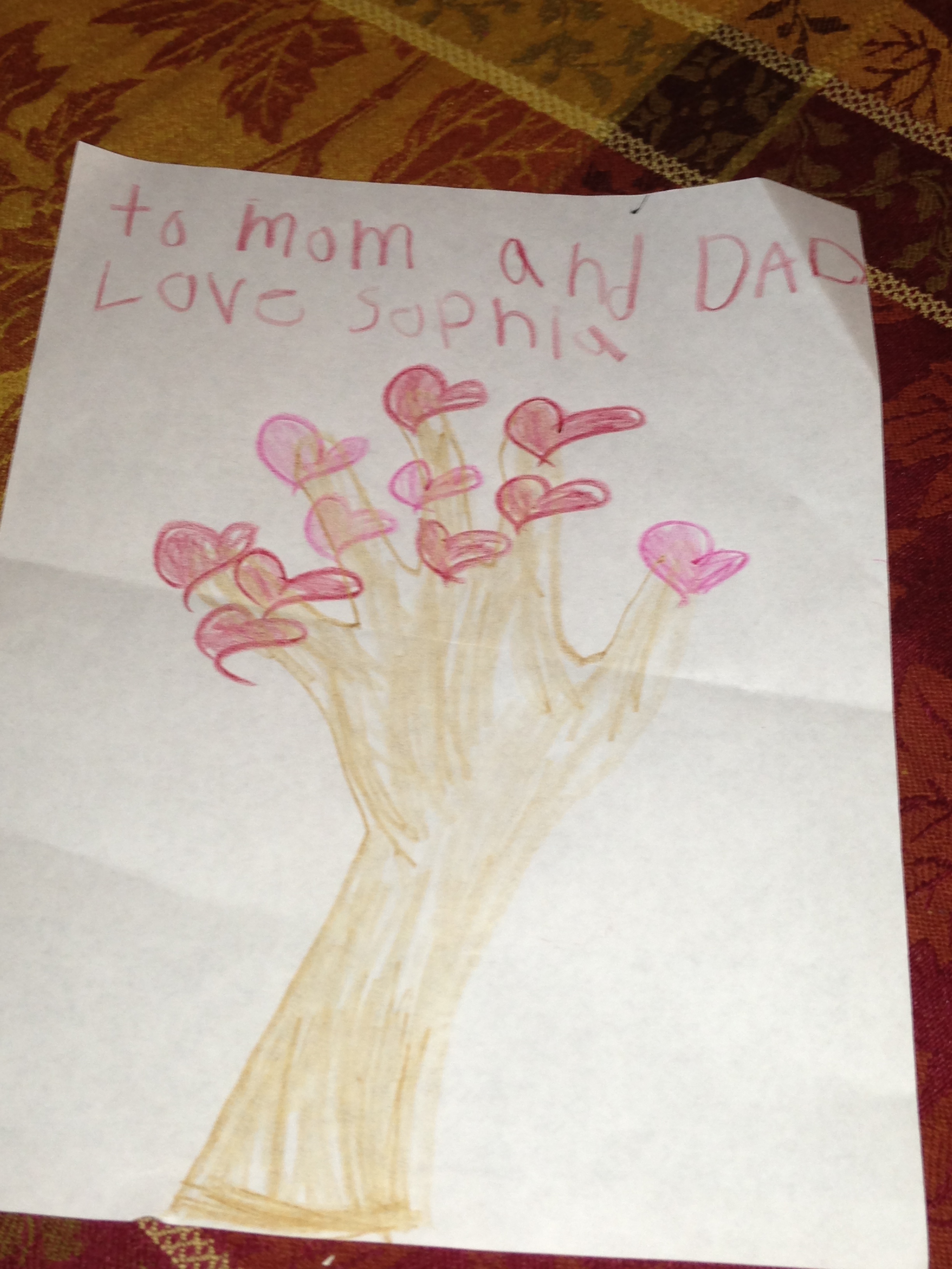 This VT was created by Sophie, of course she always signs her work of art and since it was a Valentine tree she wanted her parents to get it. I wonder why it was not given to me? I was the one who brought her to play with Liam and Natalie…Oh, well!
