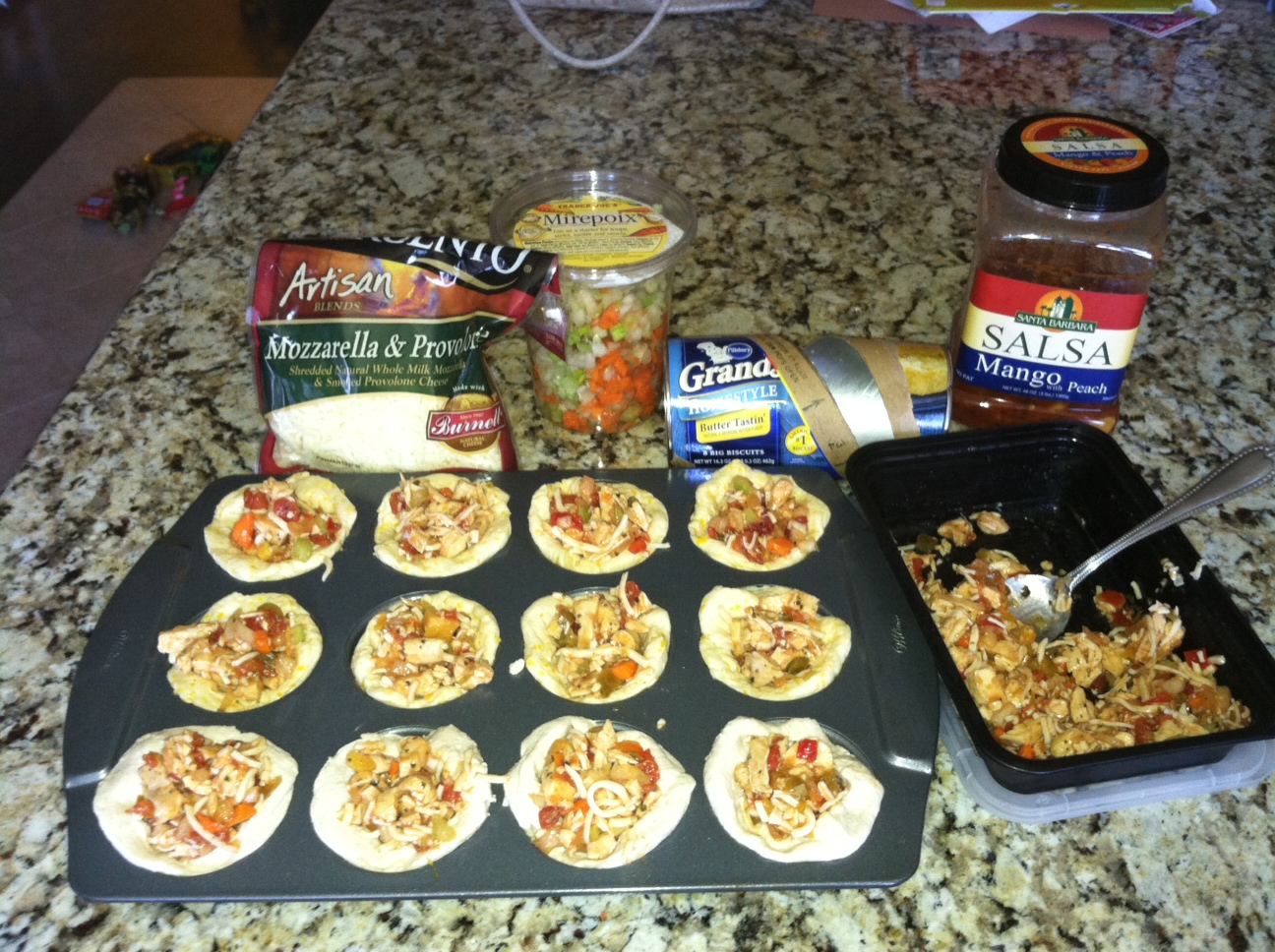 Oven 400 – Place biscuits in cupcake pan – press to form. Mix the chicken with the rest of the ingredients and let the kids fill biscuits. Bake 20 minutes or until brown (you know your oven).
