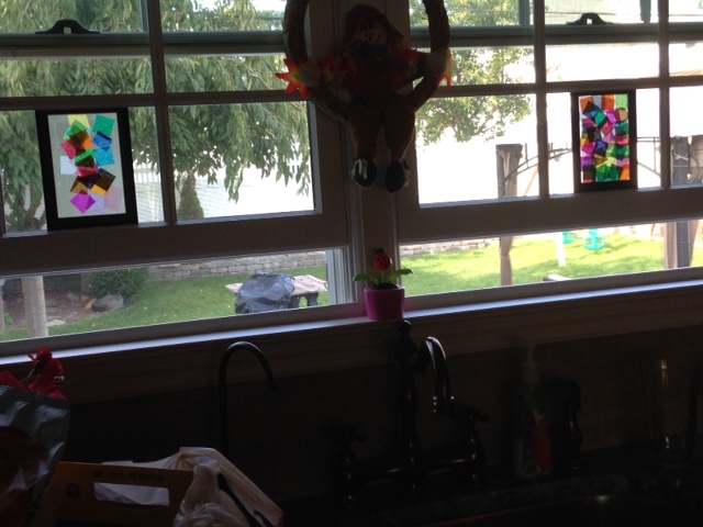 And in the end their stained glass project ended up hanging in Mom and Dad’s kitchen window reflecting all the fun they had being creative @Grandma’s