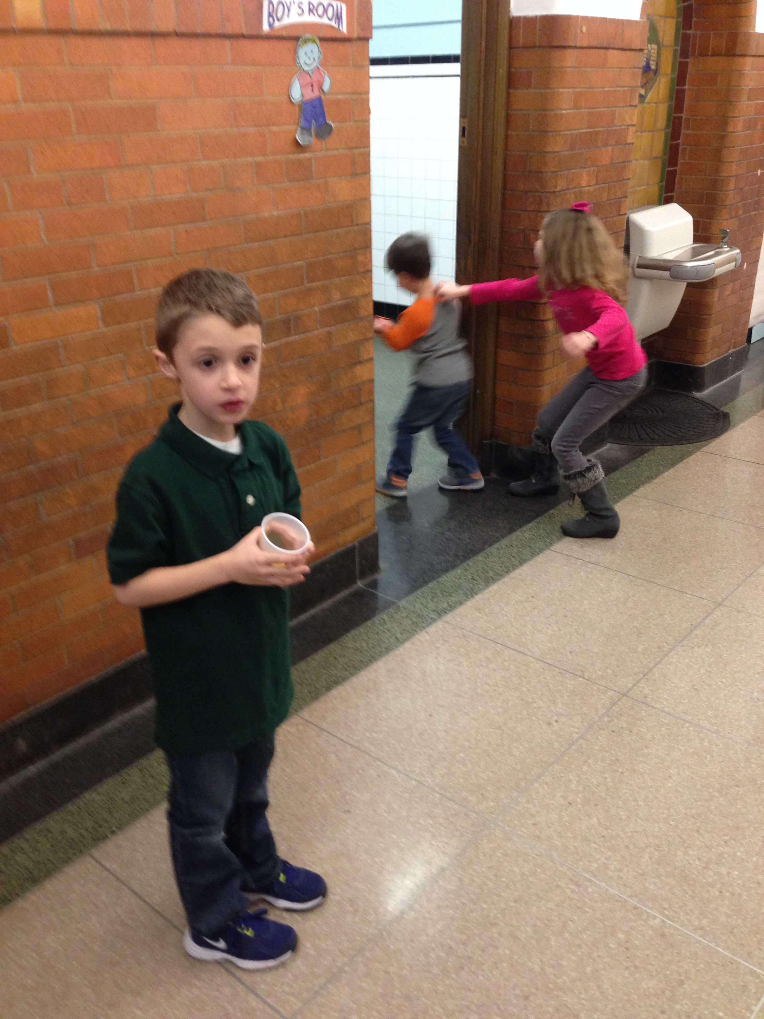 Why he wanted to run in and out of the boys room is still a mystery to us.