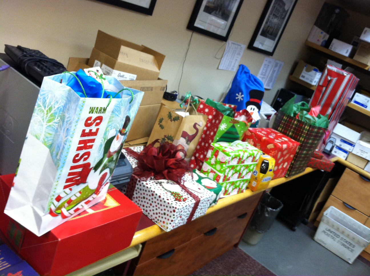 Every year we have a “Dirty Santa” gift exchange for Christmas. $50.00 limit and we pick numbers. First person picks a gift from the gift table and opens it, the next person has the option of “stealing” that gift or going to the gift table. If your gift is “stolen”, you must go to the gift table and get a new one. There is a lot of stealing and laughing and most of all good cheer.