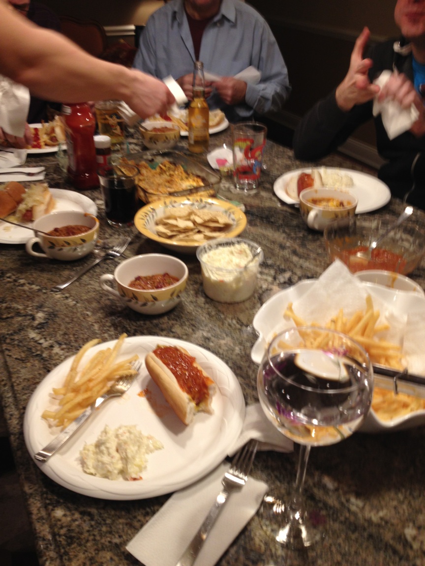 We all enjoyed eating hot dogs, with sauerkraut onions, french fries, cole slaw, and a bowl of chili. How’s that for heart healthy!
