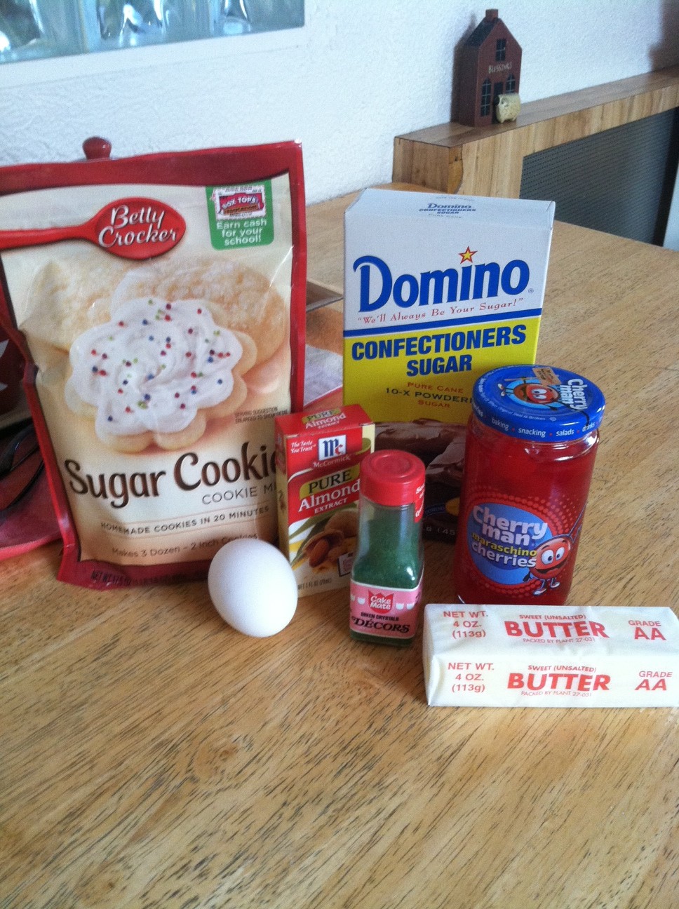 1 17.5oz pkge sugar cookie mix, 24 whole red maraschino cherries with stem (drained and patted dry) I could not find stemmed so I used destemmed. , 1 1/2 C powdered sugar, 5 tsp. milk, 1/8 tsp almond extract. 1 Tbsp. rainbow candy sprinkles.