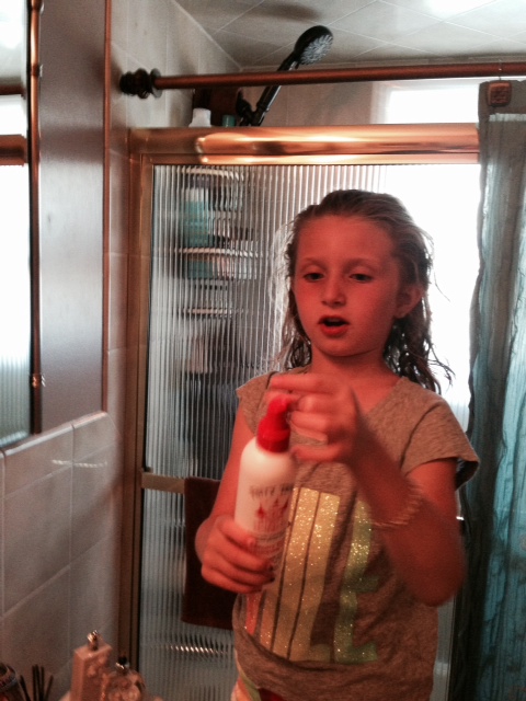After a few minutes of coaxing, and pleading, Sophie finally accepted Fairy Tales Hair product and began to spray the Rosemary Repel Conditioning Spray onto her hair.