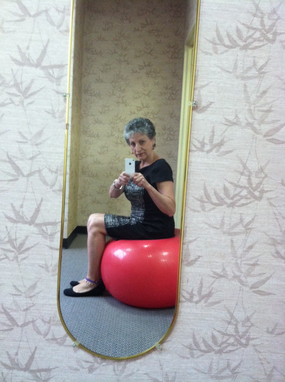 I keep this exercise ball in the ladies room lounge at work. Everyone is welcome to use it whenever they like. I make a couple of trips to the ladies room during the day and that’s when I sneak in a little exercise.