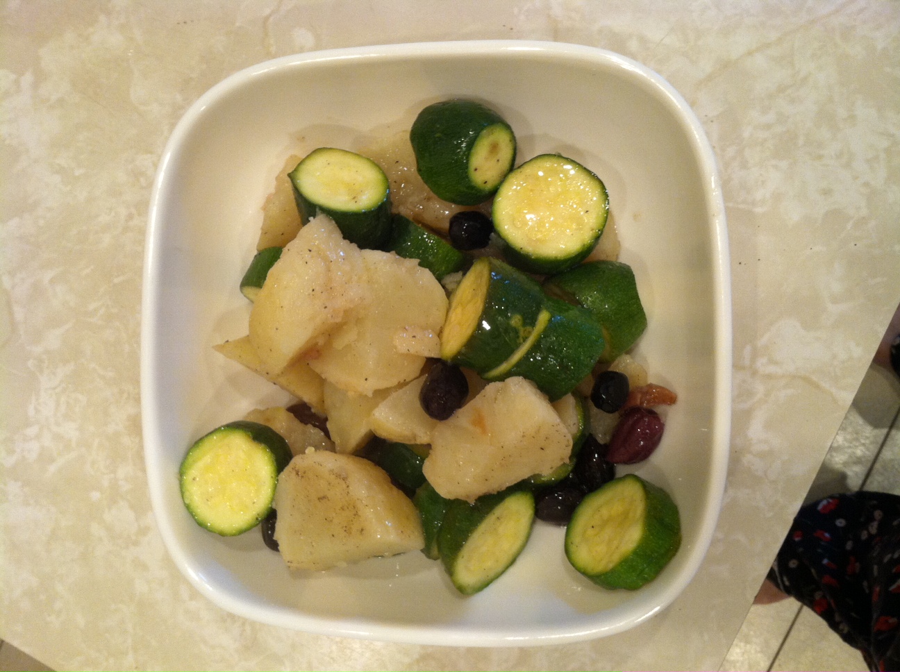 In skillet combine zucchini and potatoes and onion . Add 1 cup water. Bring to boiling, reduce heat. Simmer, covered, 8 to 10 minutes or until vegetables are tender. Drain. Put vegetables in a bowl and toss with oil, vinegar, salt and pepper to taste. Add olives or capers. Serve hot, warm or chilled.