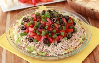 - Spread seasoned beans into a deep flat-bottomed serving dish, and layer evenly with remaining ingredients.