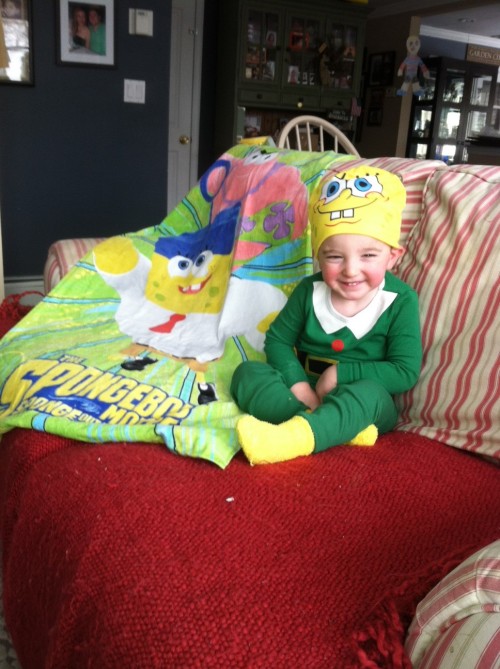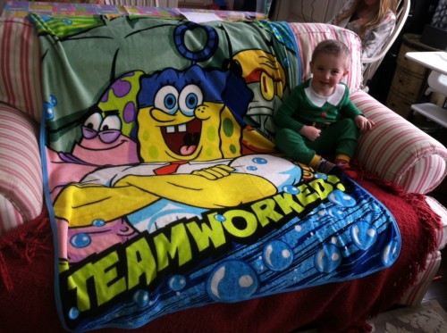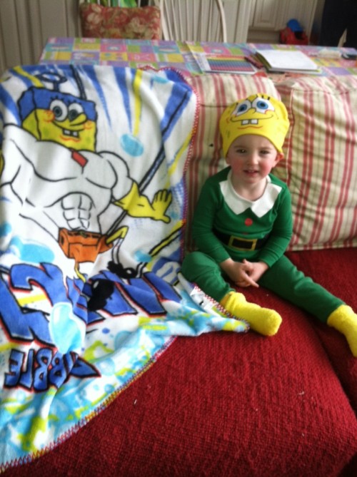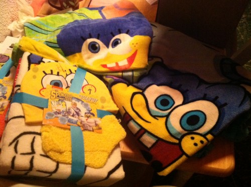 Sponge Out Of Water Cozy & Warm 3 pc. set – blanket, socks and hat. He was so happy!!