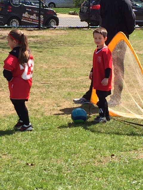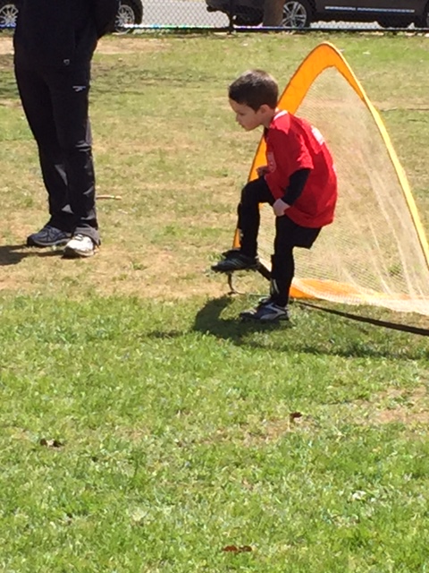 And without losing his balance or train of thought, he picked up his little leg and KICK…right out goes the ball. No score here today. Who knew! Who knew that this little guy would be a powerful goalie. His mom told me he scored two goals in the last two games.