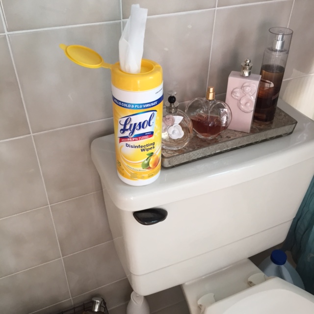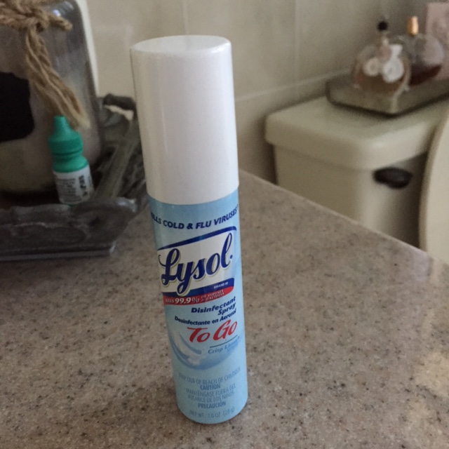 I like to spray Lysol Disinfectant on: doorknobs, light switches, sink faucets, toilet seats, remote controllers, keyboards, and phones, couches, bathtub, cabinets, shower door, vanity tops.
