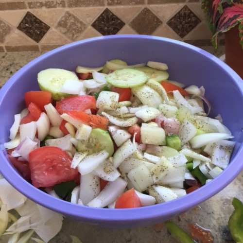 Have to share this great salad recipe. My co-worker told me this salad was easy to make and a little different. A salad without lettuce, just cucumbers, tomatoes and onions.
