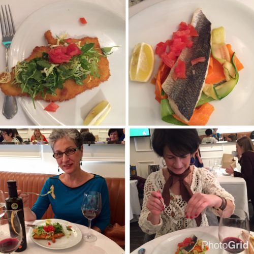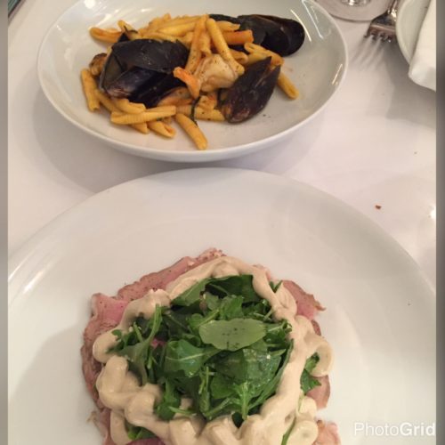 For starters Merci chose the garanelli pasta with cherry tomatoes, shrimp and mussels. I ordered the cold sliced veal rounds with tuna sauce and caper oil topped with fresh greens. Dishes so different from each other but so delicious, you know we tasted each others dish because well that’s what friends since childhood do. Have to tell you that tuna sauce and caper oil was out of this world.