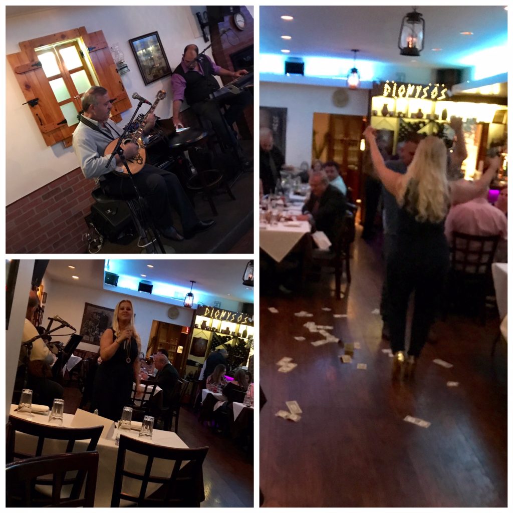 I’m not ashamed to tell you we fought over the Tzatziki Dip, it was just so perfect and we love to start a meal with it and a large Greek Salad, there also was a olive spread, I think I ate that all by myself. Delish!! Salmon and lemon potatoes for my sister, Marlene ordered the Mousaka with green beans on the side and because me and Merci ate most of the bread we split a Chicken Kebob with Lemon Potatoes and we all shared an order of Horta (steamed greens). And as we were enjoying the evening the music started.