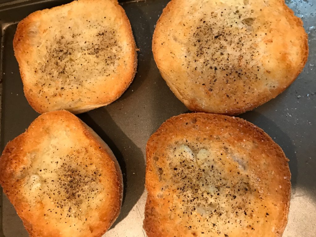 Preheat oven 500. Slice rolls in half mix olive oil and minced garlic salt and pepper. Stir and spread evenly over rolls. Bake for 10-15 minutes till edges brown. Keep an eye on them because ovens vary.