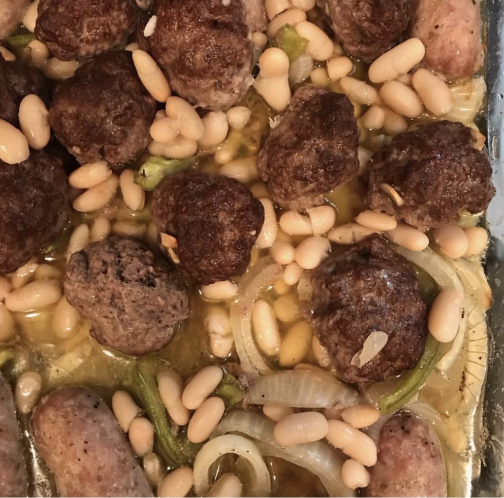 Preheat oven to 400. Toss one large sliced pepper, one large sliced onion and 3 cloves garlic with olive oil salt and pepper in a casserole pan. Place 6 Italian style sausages and a pound of your favorite meatballs on top. Bake for 45 minutes. Ovens vary so it might take one hour. Remove and toss in one can rinsed cannellini beans. Serve with garlic bread.
