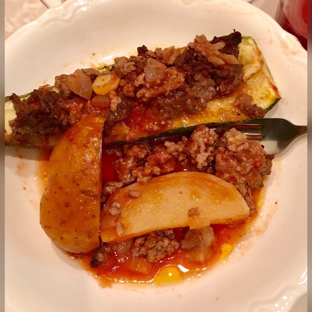 Stuffed Zucchini – A Summer Favorite #TastyTuesday Posted on August 15, 2017August 12, 2017Author liz 2 medium zucchini, halved lengthwise 1 Tbsp. olive oil 1 clove garlic 1/2 cup chopped onion 1/2 lb favorite chopped meat (beef, chicken, turkey or pork or mix) 1 cup of your favoite tomato sauce 1/4 cup your favorite wine 1/4 cup water 2 Tbsp. chopped parsley 2 small potatoes washed and quartered – optional 1. Preheat oven to 400°F. Scoop out pulp from zucchini halves, then chop pulp and set aside. Arrange zucchini halves in baking dish ; set aside.2. Heat olive oil in large skillet over medium heat. Cook garlic and onions, stirring occasionally for 1 minute. Add zucchini pulp and chopped meat and cook, stirring occasionally, 10 minutes or until meat is browned. Stir in parsley and sauce and wine and water. Bring to a boil. Lower heat. Cover and simmer 5 minutes.3. Evenly fill zucchini halves with mixture, no waste. pour any extra around zucchini. Put potatoes around the zucchini . Bake 30 minutes or until zucchini/potatoes are tender.