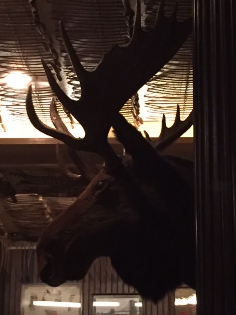 A head of a moose was giving us a side stare as we sat in the upstairs dining room. Every time I see a moose’s head protruding out of a wall, I always think of Abbott and Costello’s movie Hold that Ghost, where Moose (a character in the film) said,” I keep my money in my head.” So goes the joke. Love, love, Abbott and Costello films. Their comedy was simple, but funny.