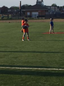 Our little future (dreaming) ball player standing on green grass turf. To my surprise the turf was man made. WHAT! What happened to the good old grassy ground with weeds and all? Well, the good news is he won’t have grass stains on his new baseball uniform.