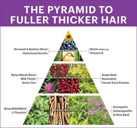 The ingredients in Hair Detox® are based on a specially developed pyramid that includes the ingredients most often associated with healthy hair, skin and nails, as well as two Matrix Blends that are exclusive to Hair Detox®.