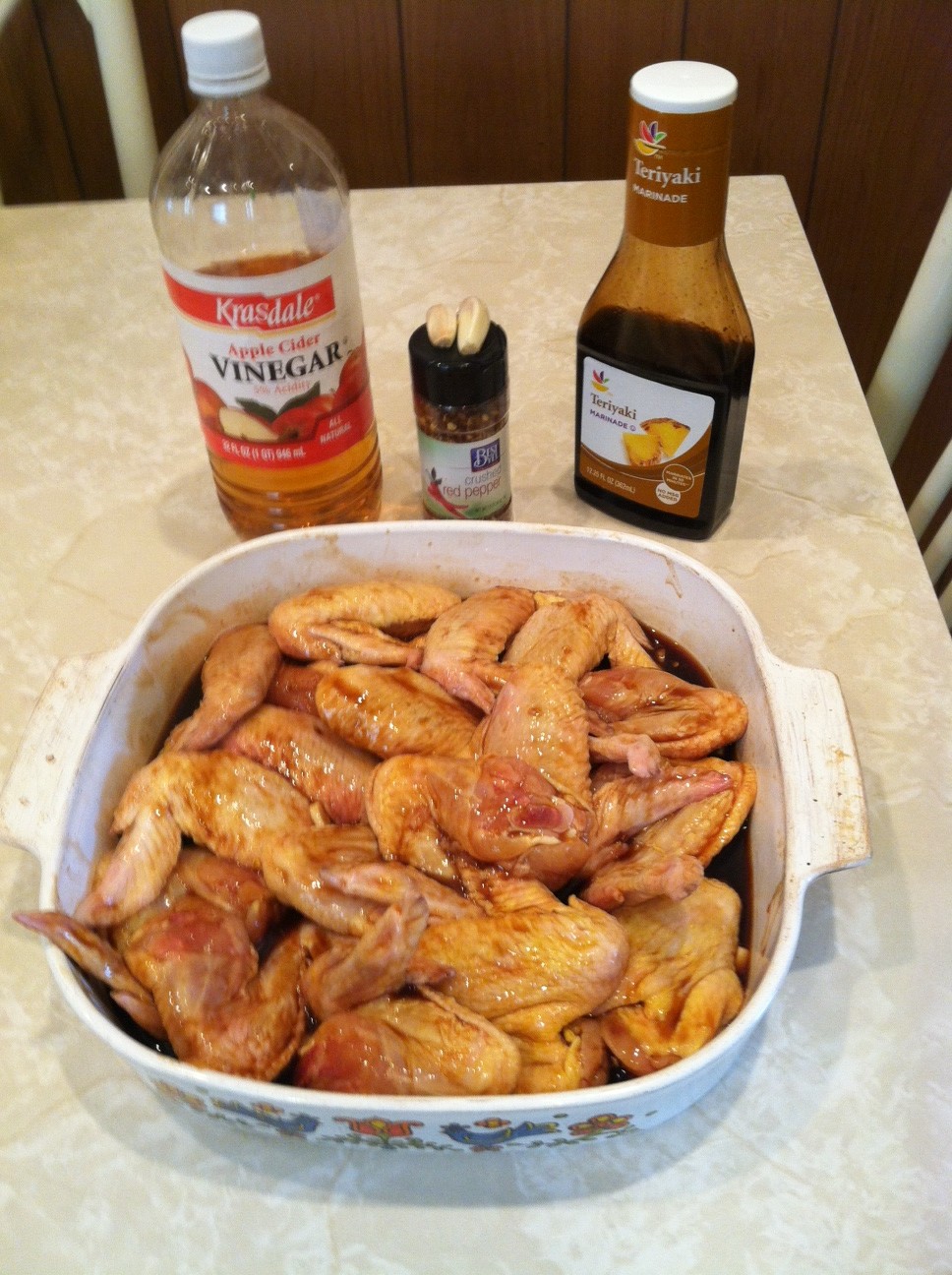 I love chicken wings in Teriyaki sauce. Sometimes I serve them as a appetizer, sometimes as the heart of the meal. I like to use ingredients I find in my cupboard. Here is my quick and simple recipe:
