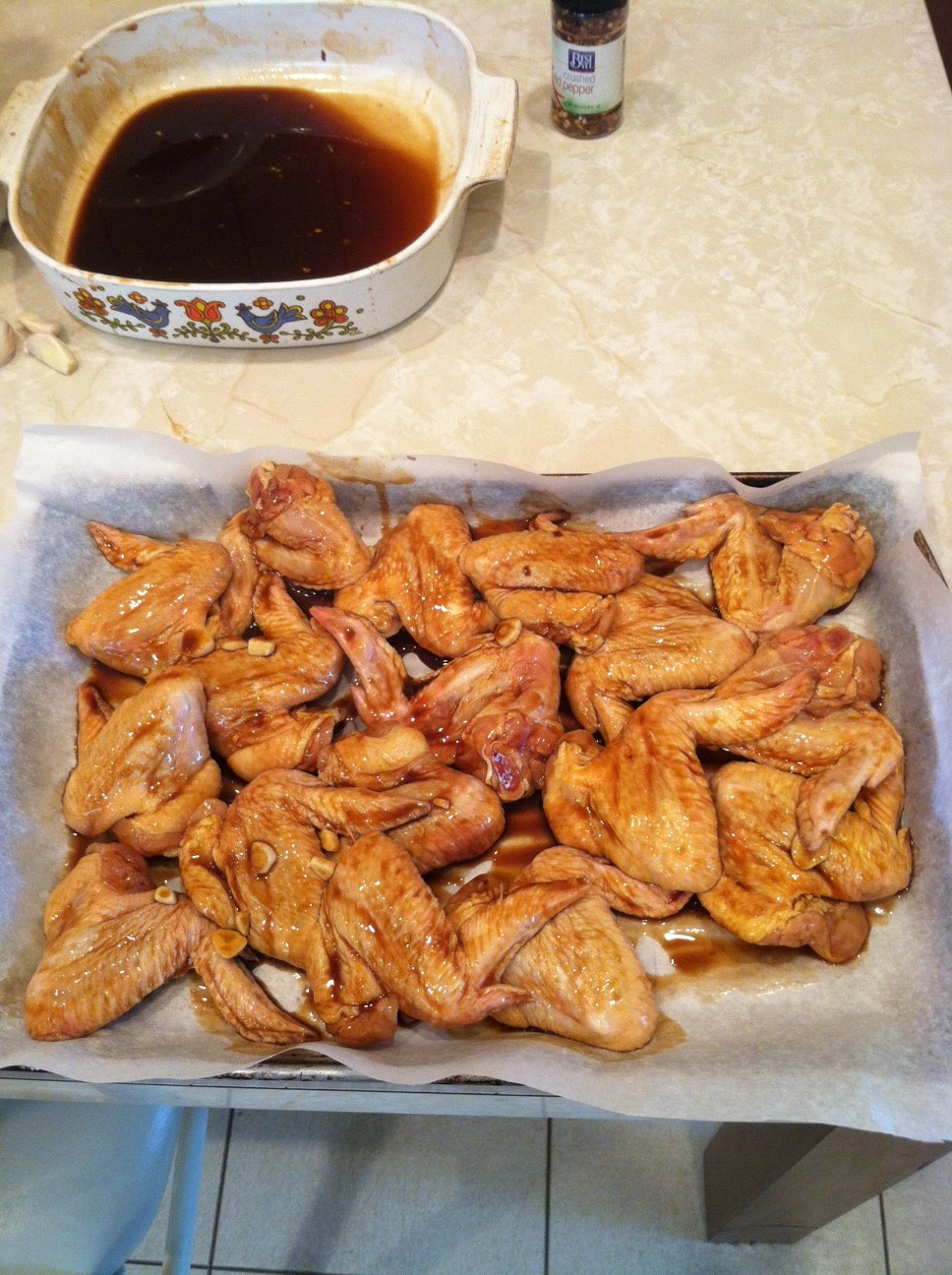 Cover baking sheet pan with parchment paper (for easy clean up). Place wings on parchment covered baking pan, spoon some of the sauce on top and bake for 1/2 hour and turn over, bake another 1/2 hour.